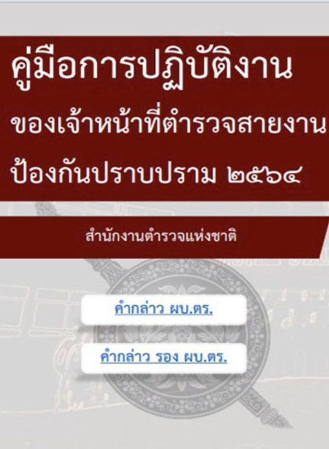 08 คู่มือการปฏิบัติงานสำหรับเจ้าหน้าที่ ข้อมูลเกี่ยวกับคู่มือหรือมาตรฐานการปฏิบัติงาน ตามภารกิจของแต่ละงาน (งานอำนวยการ งานป้องกันปราบปราม งานจราจร งานสืบสวน และงานสอบสวน) 📓 คู่มือปฏิบัติงานอำนวยการ 📓 คู่มือปฏิบัติงานป้องกันปราบปราม 📓 คู่มือปฏิบัติงานจราจร 📓 คู่มือปฏิบัติงานสืบสวน 📓 คู่มือปฏิบัติงานสอบสวน 📓 คู่มือแบบฝึกพระราชทาน 📓 คู่มือขับเคลื่อนโครงการต่างๆ Facebook iconFacebookTwitter iconTwitterLINE iconLine