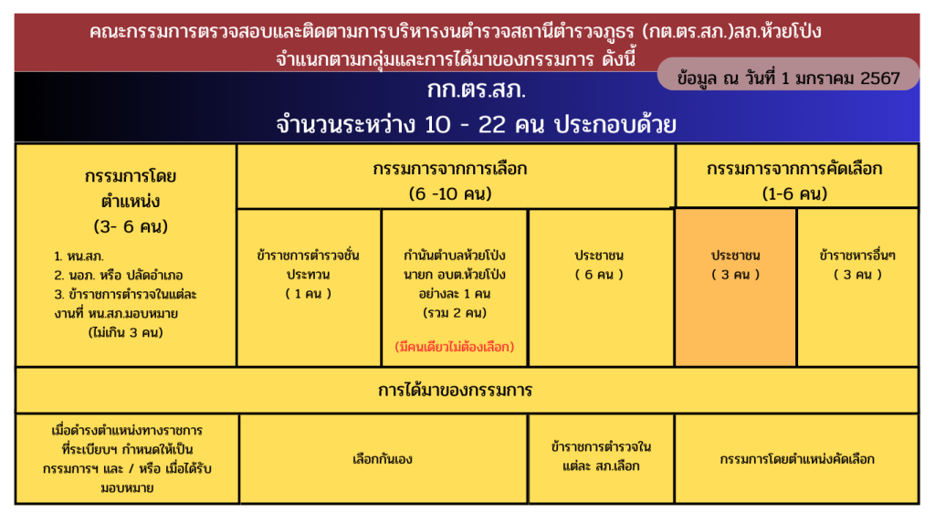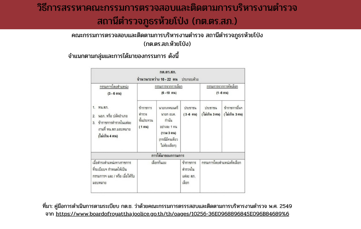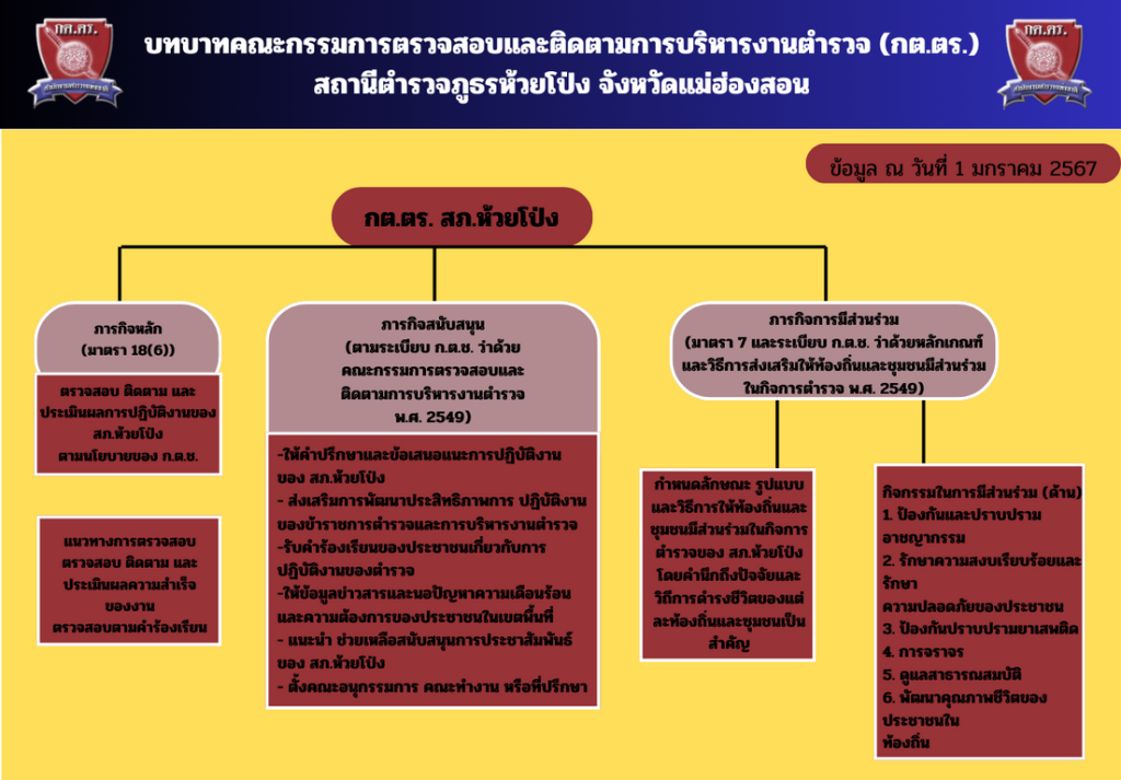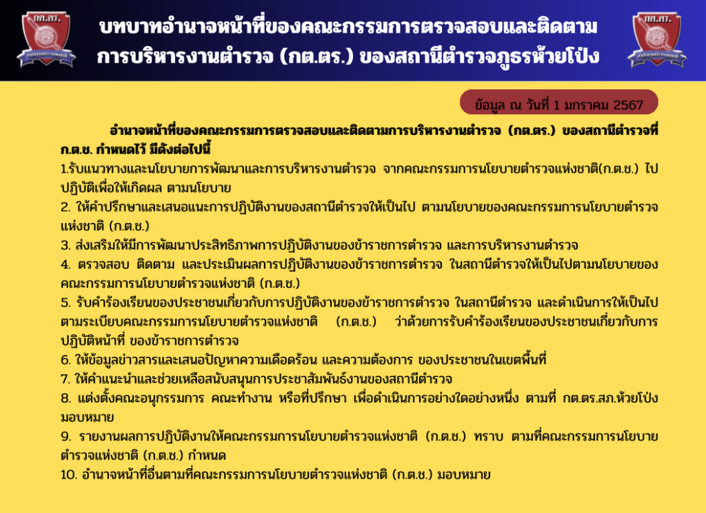 04 ข้อมูลคณะกรรมการตรวจสอบและติดตามการบริหารงานตำรวจ (กต.ตร.) ของสถานีตำรวจ บทบาท อำนาจหน้าที่ คณะกรรมการตรวจสอบ และติดตามการบริหารงานตำรวจ (กต.ตร.) สถานีตำรวจภูธรห้วยโป่ง จังหวัดแม่ฮ่องสอน ข้อมูล ณ วันที่ 1 มกราคม 2567 รายชื่อคณะกรรมการตรวจสอบ และติดตามการบริหารงานตำรวจ (กต.ตร.) สถานีตำรวจภูธรห้วยโป่ง จังหวัดแม่ฮ่องสอน ผลการดำเนินงานของ กต.ตร. สถานีตำรวจ ที่ผ่านมาในรอบ 6 เดือนแรกของปีงบประมาณ พ.ศ. 2567 สถานีตำรวจภูธรห้วยโป่ง จังหวัดแม่ฮ่องสอน Facebook iconFacebookTwitter iconTwitterLINE iconLine