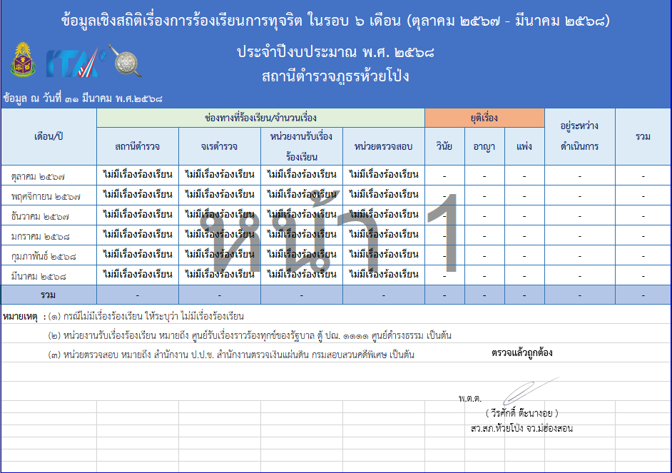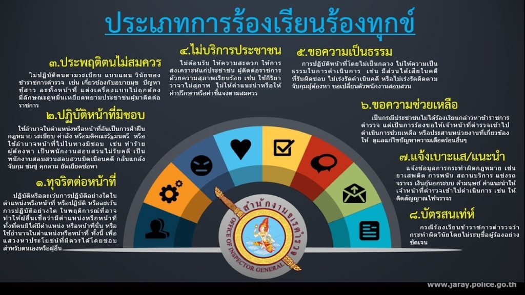 O17 : ช่องทางการแจ้งเรื่องร้องเรียนการทุจริตและข้อมูลเชิงสถิติเรื่องร้องเรียนการทุจริต ช่องทางการแจ้งเรื่องร้องเรียนการทุจริตและข้อมูลเชิงสถิติเรื่องร้องเรียนการทุจริต ข้อมูล ณ วันที่ 31 มีนาคม พ.ศ.2568 ช่องทางการแจ้งเรื่องร้องเรียนการทุจริต / แจ้งเบาะแสการทุจริต และประพฤติมิชอบของเจ้าหน้าที่ ผ่านแบบฟอร์ม ช่องทางออนไลน์ ของ สถานีตำรวจภูธรห้วยโป่ง [**ข้อมูลของท่านจะเป็นความลับ**][**ให้ปฏิบัติตามคู่มือการปฏิบัติในการจัดการเรื่องร้องเรียนการทุจริต / แจ้งเบาะแสการทุจริตและประพฤติมิชอบ ประจำปีงบประมาณ พ.ศ.2568ของสถานีตำรวจภูธรห้วยโป่ง**] ด้านล่างแบบฟอร์มนี้[**ผู้แจ้งเรื่องร้องเรียน จะได้รับการปกป้อง คุ้มครอง ดูแล ตามประกาศคำสั่ง มาตรการป้องกัน คุ้มครองดูแล ผู้แจ้งเบาะแสการทุจริตและประพฤติมิชอบประจำปีงบประมาณ พ.ศ.2568 ของสถานีตำรวจภูธรห้วยโป่ง ประกาศไว้ท้ายของหน้านี้ ข้าพเจ้าขอรับรองว่า ข้อเท็จจริงที่ได้ยื่นร้องเรียนต่อ สารวัตรสถานีตำรวจภูธรห้วยโป่ง เป็นความจริงทุกประการ และขอรับผิดชอบต่อข้อเท็จจริงดังกล่าวข้างต้นทั้งหมด และข้าพเจ้ารับทราบว่าการนำความเท็จมาร้องเรียนต่อเจ้าหน้าที่ ซึ่งทำให้ผู้อื่นได้รับความเสียหาย เป็นความผิดตามประมวลกฎหมายอาญาฐานแจ้งความเท็จต่อเจ้าพนักงาน*** ขอรับรองว่าเป็นความจริง / อื่น ๆ คู่มือการปฏิบัติในการจัดการเรื่องร้องเรียน การทุจริต / แจ้งเบาะแสการทุจริต และประพฤติมิชอบ ประจำปีงบประมาณ พ.ศ.2568 ของสถานีตำรวจภูธรห้วยโป่ง ช่องทางอื่นๆ สำหรับให้บริการประชาชน ในการแจ้งเรื่องร้องเรียน / แจ้งเบาะแส การทุจริต/แจ้งเบาะแสประพฤติมิชอบ ของเจ้าหน้าที่ ของ สถานีตำรวจภูธรห้วยโป่ง {**ให้ปฏิบัติตามคู่มือการปฏิบัติในการจัดการเรื่องร้องเรียนการทุจริต / แจ้งเบาะแสการทุจริตและประพฤติมิชอบ ประจำปีงบประมาณ พ.ศ.2568 ของสถานีตำรวจภูธรแม่จริม**} {**ผู้แจ้งเรื่องร้องเรียน จะได้รับการปกป้อง คุ้มครอง ดูแล ตามประกาศคำสั่ง มาตรการป้องกัน คุ้มครองดูแล ผู้แจ้งเบาะแสการทุจริตและประพฤติมิชอบ ประจำปีงบประมาณ พ.ศ.2568 ของสถานีตำรวจภูธรแม่จริม ประกาศไว้ท้ายของหน้านี้**} แบบฟอร์ม ออนไลน์ ติดต่อด้วยตนเอง ทรศัพท์ & โทรสาร : 053 060 051 (ตลอด 24 ชม.) หนังสือราชการ งานอำนวยการ ชั้น 2 Messenger : สถานีตำรวจภูธรห้วยโป่ง line Official : สถานีตำรวจภูธรห้วยโป่ง จดหมาย/ไปรษณีย์ : E-mail Facebook Website : เวปไซต์ สถานีตำรวจภูธรห้วยโป่งhttps://huaipong.maehongson.police.go.th ช่องทางการแจ้งเรื่องร้องเรียน / แจ้งเบาะแส ประพฤติมิชอบ ของเจ้าหน้าที่ ผ่านช่องทางออนไลน์ สำนักงานจเรตำรวจ ระบบร้องเร